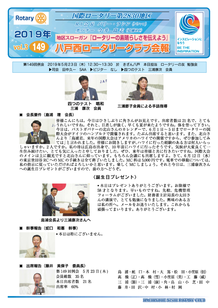 149回 八戸西ロータリークラブ会報