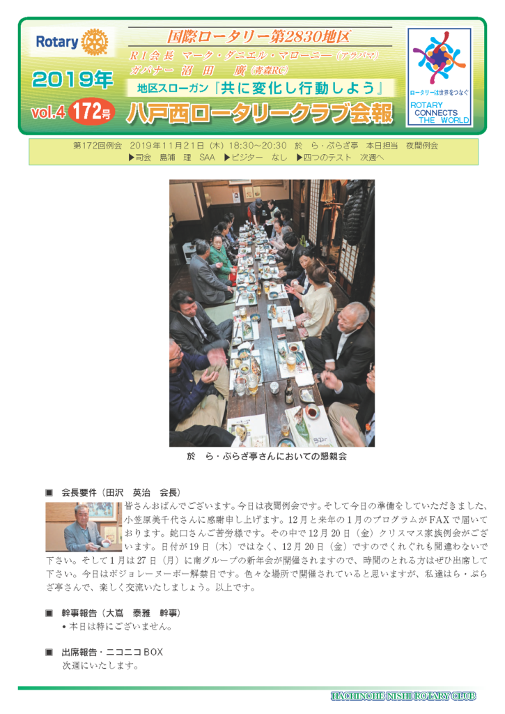172回 八戸西ロータリークラブ会報