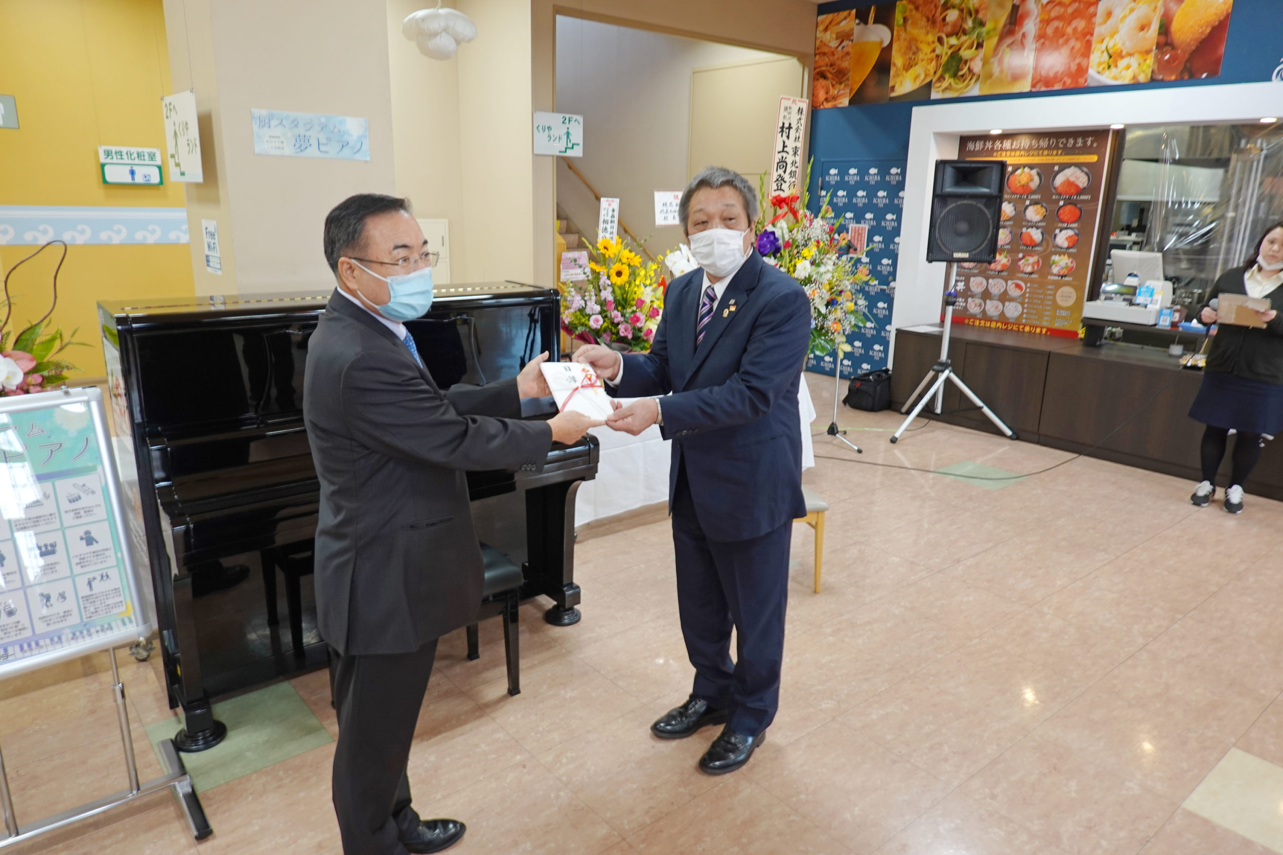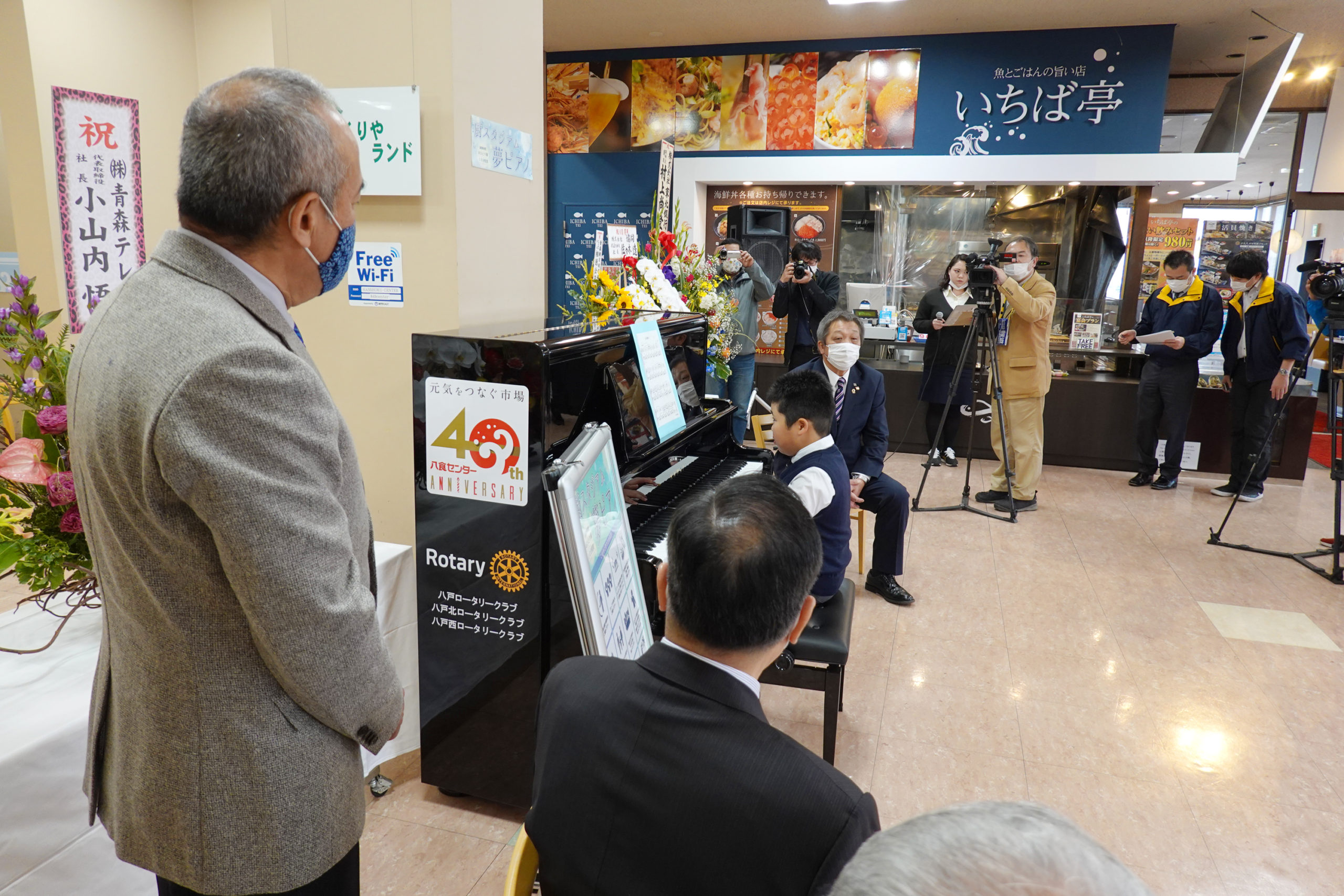 11月15日(日)、八食センターにて、地区補助金を使った3クラブ(八戸RC・八戸北RC・八戸西RC)合同事業として寄贈した「夢ピアノ」の目録贈呈と子どもたちにおける演奏会が行われました。夢ピアノは1階厨スタジアムに設置されました。八食センターは今年開業40周年ということで八戸を代表する観光の拠点にふさわしい事業になると考えております。