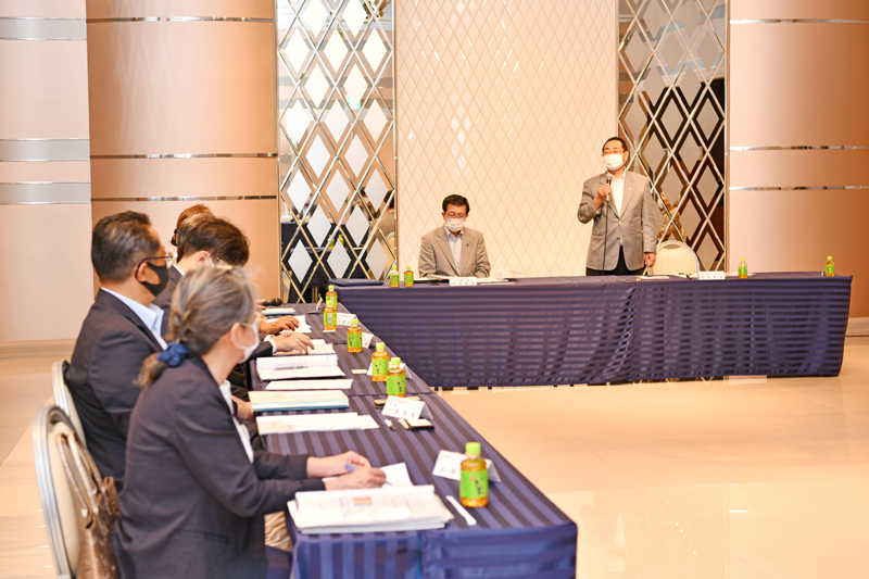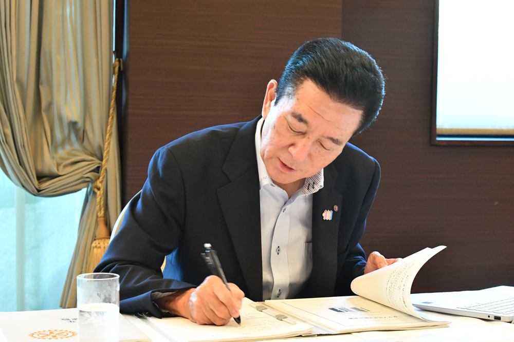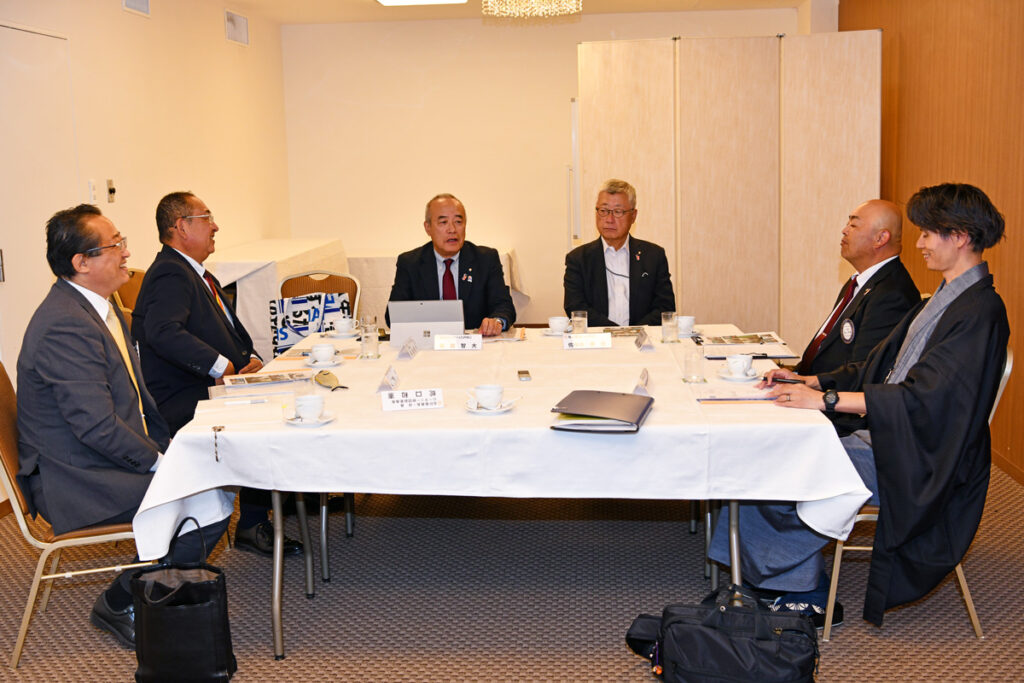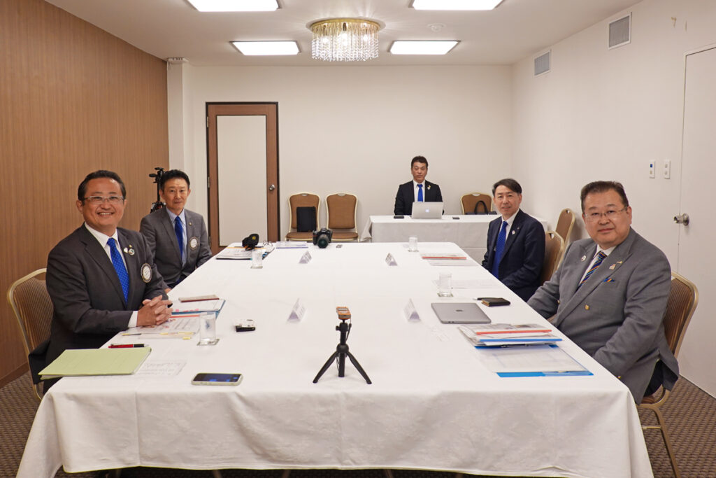 ※写真は左手前から時計回りに大嶌会長・蛇口幹事・今副幹事長・島浦ガバナー補佐・花田ガバナーです。