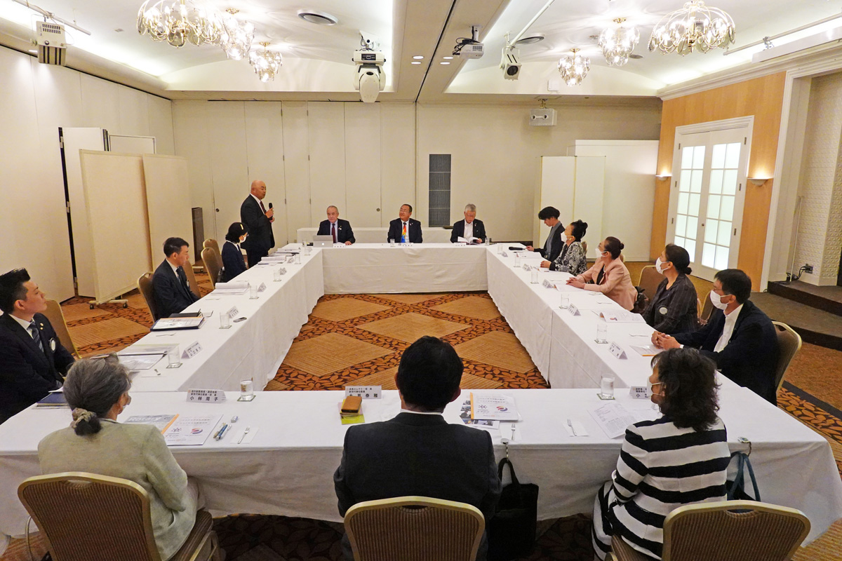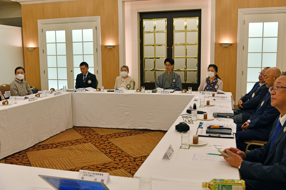 ※写真は左手前から時計回りに大嶌会長・蛇口幹事・今副幹事長・島浦ガバナー補佐・花田ガバナーです。