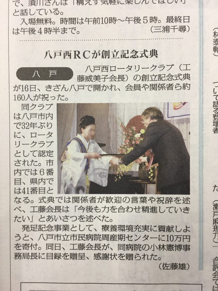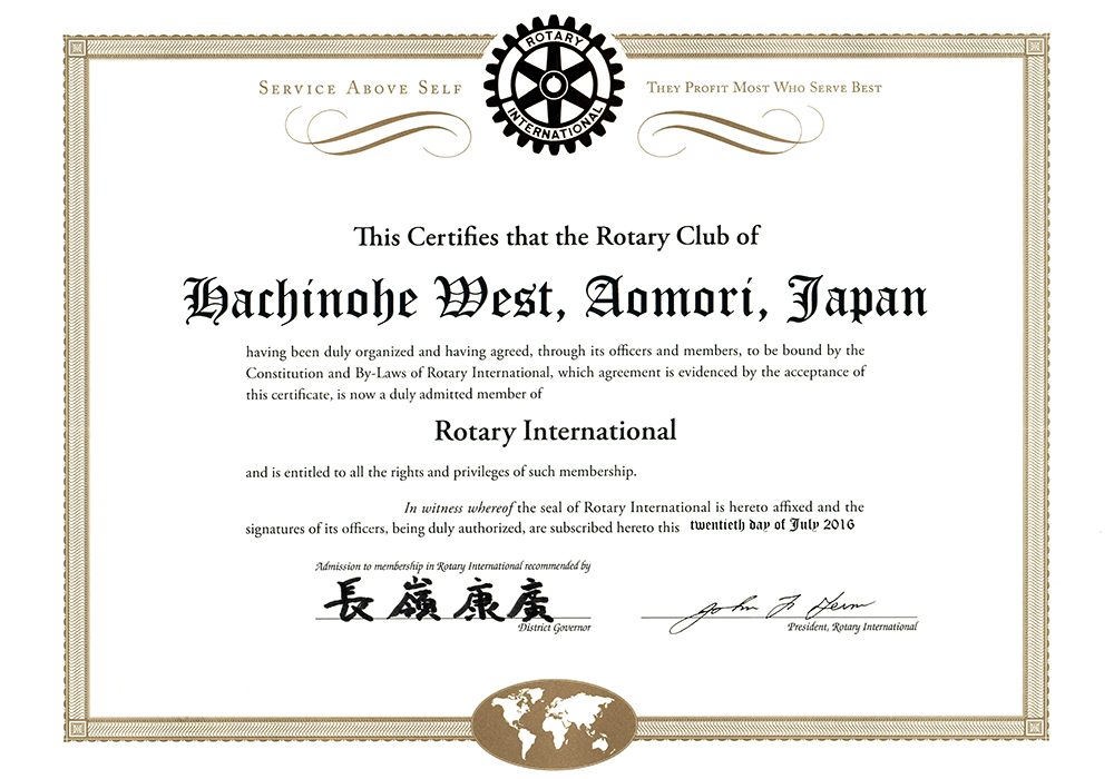 八戸西RCは、2016年7月20日にRI理事会にて新クラブとして認証され、これを祝したチャーターナイトを開催した。